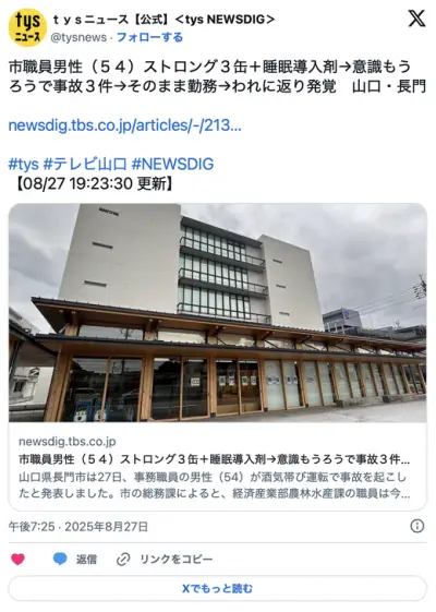 ストロング3本と睡眠薬で意識朦朧のまま出勤→我に返る→市職員「通勤中に事故3件起こした」