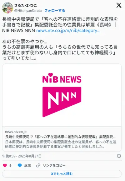 【長崎】長崎中央郵便局で「客への不在連絡票に差別的な表現を手書きで記載」集配委託会社の従業員は解雇