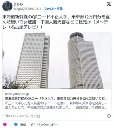 東海道新幹線のQRコード不正入手、乗車券12万円分を盗んだ疑いで中国籍の女逮捕 中国人観光客に転売か