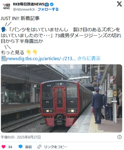 【福岡】「パンツをはいていませんし裂け目のあるズボンをはいていましたので陰部が…」73歳男ダメージジーンズの切れ目から下半身露出か
