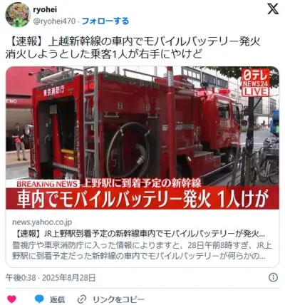 【速報】JR上野駅到着予定の新幹線車内でモバイルバッテリーが発火 けが人1人