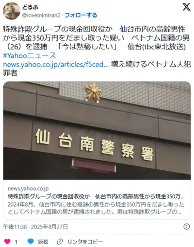 【仙台】グェン容疑者逮捕 特殊詐欺グループの現金回収役か 仙台市内の高齢男性から現金350万円をだまし取った疑い