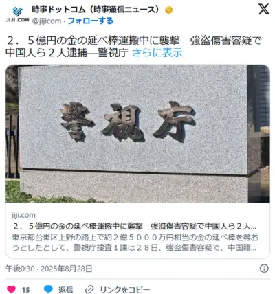 2.5億円の金の延べ棒運搬中に襲撃 強盗傷害容疑で中国人ら2人逮捕―警視庁