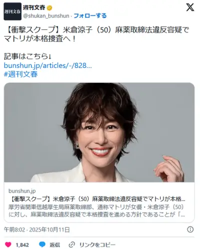 【文春】米倉涼子(50)さん、麻薬取締法違反疑惑