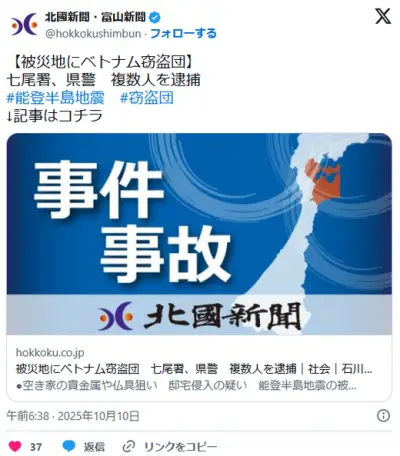 能登大地震 ベトナム人強盗団が暗躍 確認されただけで2500万円の被害