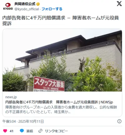 【さいたま】内部告発者に4千万円賠償請求 障害者ホームが元役員提訴