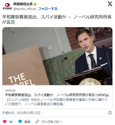 平和賞受賞者流出、スパイ活動か ノーベル研究所所長が言及
