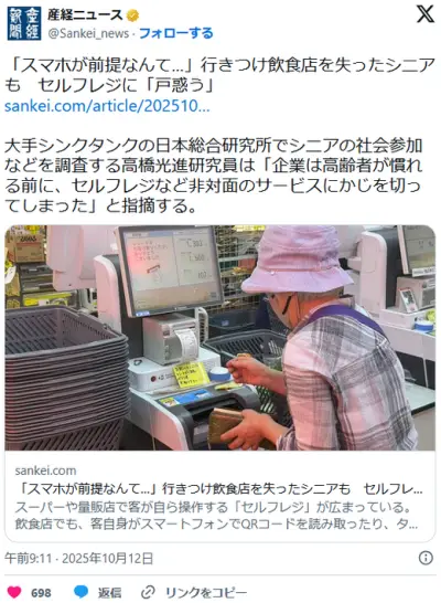 「スマホが前提なんて…」行きつけ飲食店を失ったシニアも セルフレジに「戸惑う」