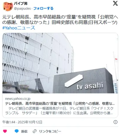 【テレビ】元テレ朝局長、高市早苗総裁の“度量”を疑問視 「公明党への感謝、敬意なかった」 田﨑史郎氏も同意