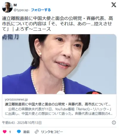 連立離脱直前に中国大使と面会の公明党・斉藤代表、高市氏についての内容は「そ、それは、あのー…控えさせて」