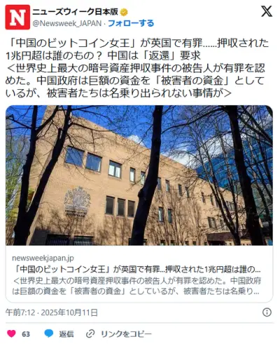 イギリスで中国人女性(47)が有罪、1兆1650億円分のビットコイン押収、12万8000人を騙し資金をビットコインに 中国政府は返還要求