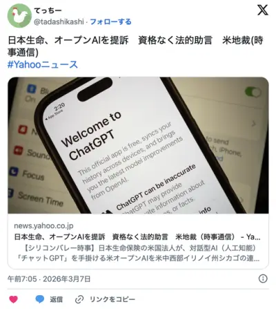 日本生命「契約者がChatGPTで無駄に知恵をつけて損失ぶっこいたからOpenAIを訴える」