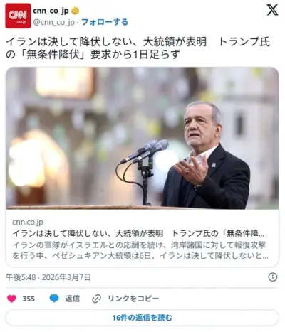 【イラン】ペゼシュキアン大統領「回避を試みたが、自衛の道しかなかった」報復攻撃を釈明、軍も声明「米とイスラエル以外に敵意はない」