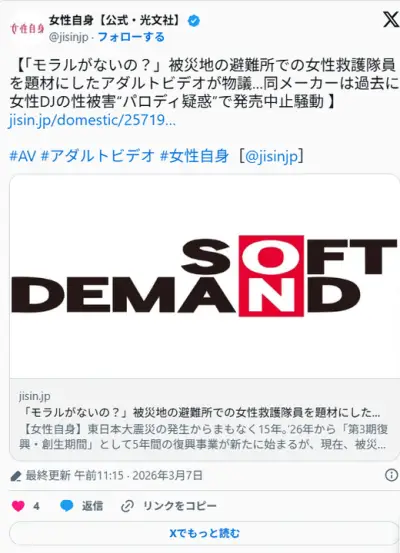 「モラルがないの?」被災地の避難所での女性救護隊員を題材にしたアダルトビデオが物議