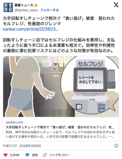 【無銭飲食】大手回転すしチェーンで相次ぐ「食い逃げ」被害 狙われたセルフレジ、性善説のジレンマ