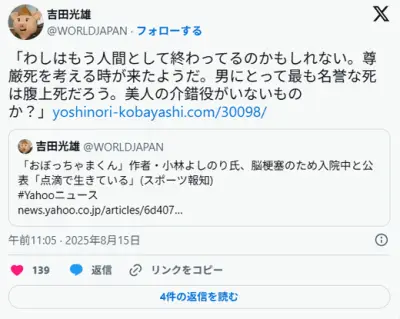 小林よしのり「わしはもう人間として終わってるのかもしれない。尊厳死を考える時が来たようだ」