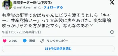 共産党員「おばちゃんにビラ渡そうとしら『キャー共産党怖いー』って大袈裟に声あげた。なんなの」