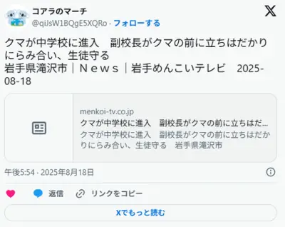 【(・(ェ)・)】クマが中学校に進入 副校長がクマの前に立ちはだかりにらみ合い、生徒守る 岩手県滝沢市