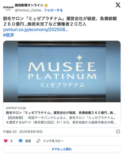【美容】脱毛サロン「ミュゼプラチナム」運営会社が破産、負債総額260億円…施術未完了など債権者20万人