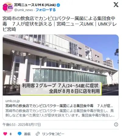 【宮崎】飲食店でカンピロバクター食中毒、7人に症状 鳥刺しなどを食べたとみられる