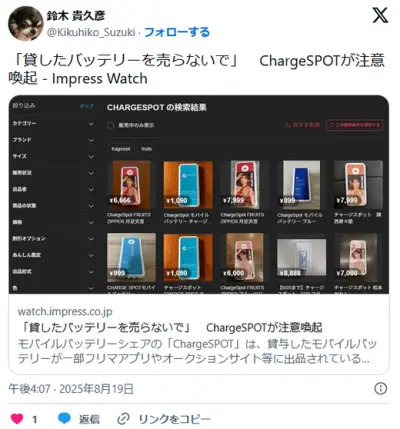 【日本】「貸したバッテリーを売らないで」 ChargeSPOTが注意喚起