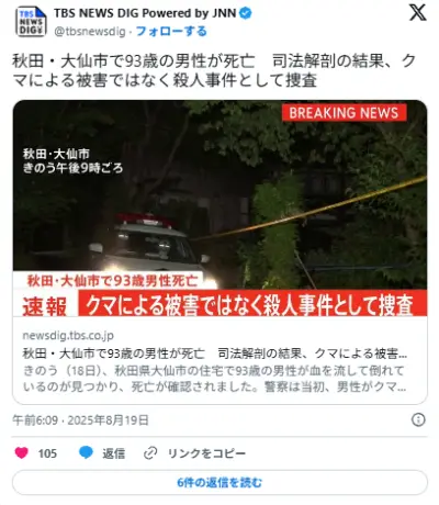 93歳男性が自宅で死亡→秋田県警「熊に襲われた可能性」→県警「司法解剖したら殺人事件だわw」
