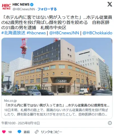 【北海道】「ホテル内に客ではない男が…」 ホテル従業員の62歳男性を投げ飛ばし顔を殴り首を絞める 自称医師の31歳の男を逮捕 札幌