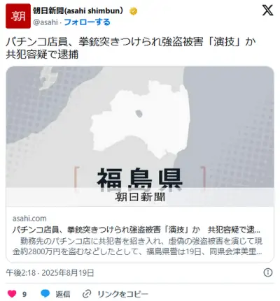 【自作自演】パチンコ店員(23)、拳銃突きつけられ強盗被害「演技」か 共犯容疑で逮捕 現金約2800万円を盗む