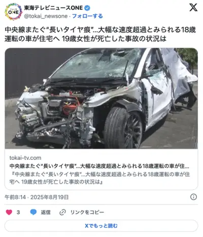 30km/h制限を200kmか?ブレーキ痕50m(100km)+家を半壊にする速度(100km)テスラの18歳車カス