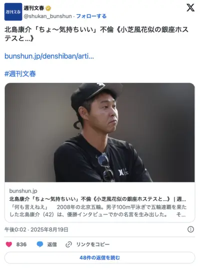 【文春】北島康介「ちょ~気持ちいい」不倫《小芝風花似の銀座ホステスと…》