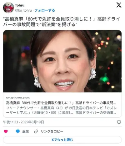 【芸能】高橋真麻「80代で免許を全員取り消しに!」 高齢ドライバーの事故問題で、高齢者の運転免許取り消し法を提案