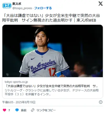 【MLB】「大谷は謙虚ではない」少女が全米生中継で突然の大谷翔平批判 サイン無視された過去明かす