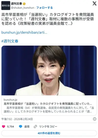 【文春】高市早苗首相が「当選祝い」カタログギフトを衆院議員に配っていた!取材に複数の事務所が受領を認める