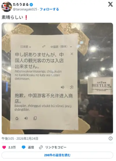 申し訳ありませんが、中国人の観光客の方は入店できません