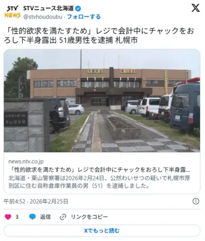 【ピッ╰⋃╯ペイペイ】「性的欲求を満たすため」レジで会計中にチャックをおろし下半身露出 51歳男性を逮捕 札幌市