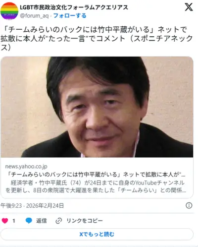 「チームみらいのバックには竹中平蔵がいる」ネットで拡散に本人が“たった一言”でコメント