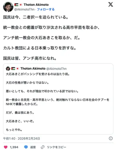 れいわ支持者「国民は今、二者択一を迫られている。高市早苗を取るか、大石あきこを取るか、だ。」