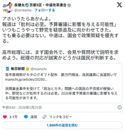 【カタログギフト】中革連・泉「報道はいつもこうやって野党を疑惑追及に向かわせてきた。乗る必要はない」