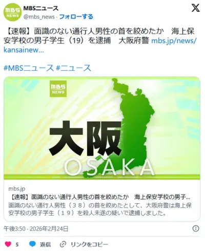 【大阪】面識のない通行人男性の首を絞めたか 海上保安学校の男子学生(19)を逮捕