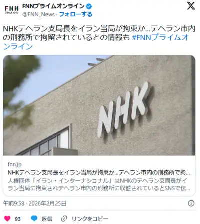 NHKテヘラン支局長をイラン当局が拘束か…テヘラン市内の刑務所で拘留されているとの情報も (人権団体)