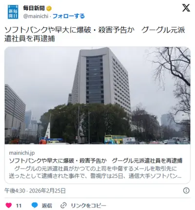 グーグル元派遣社員(33)、ソフトバンクに爆破・殺害予告