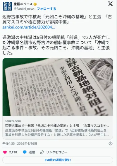 極左ゲリラ なんの関係があるのか辺野古事故を「基地が元凶」「右派の誹謗中傷」と主張