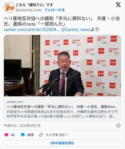 【辺野古転覆】共産・小池、ヘリ基地反対協への援助「手元に資料ない」 遺族のnote「一部読んだ」
