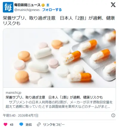 栄養サプリ、取り過ぎ注意 日本人「2割」が過剰、健康リスクも