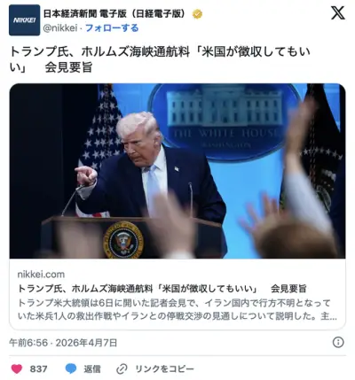 トランプ大統領、軍事的に敗北したイランに代わり米国がホルムズ海峡の通行料を徴収することを検討