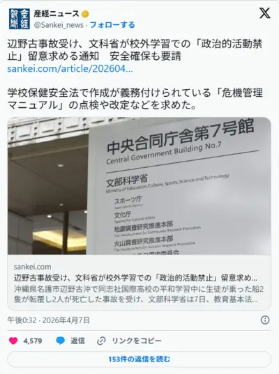 【辺野古転覆】文科省、校外学習での「政治活動禁止」を通知 生徒を道具にしてきた日教組さん涙目へ