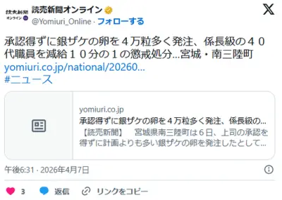 【宮城】承認得ずに銀ザケの卵を4万粒多く発注、係長級の40代職員を減給10分の1の懲戒処分…南三陸町