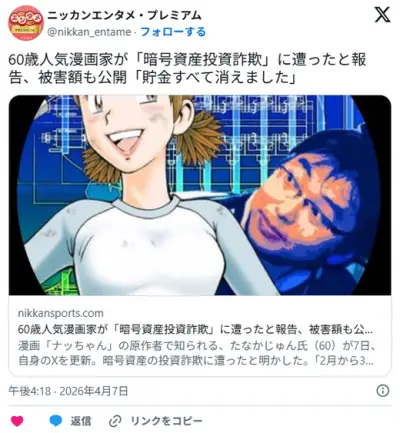 漫画家・たなかじゅん氏「暗号資産投資詐欺」に遭ったと報告、被害額も公開「貯金すべて消えました。返ってくることは絶望的」