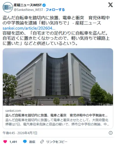 【大阪】盗んだ自転車を踏切内に放置、電車と衝突 育児休暇中の中学教諭を逮捕「軽い気持ちで」