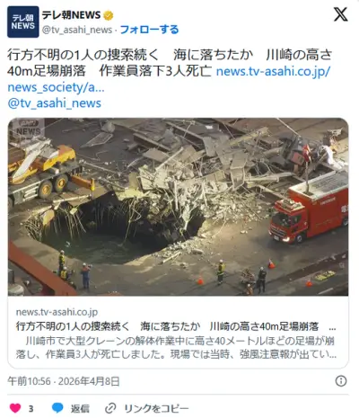 行方不明の1人の捜索続く 海に落ちたか 川崎の高さ40m足場崩落 作業員落下3人死亡